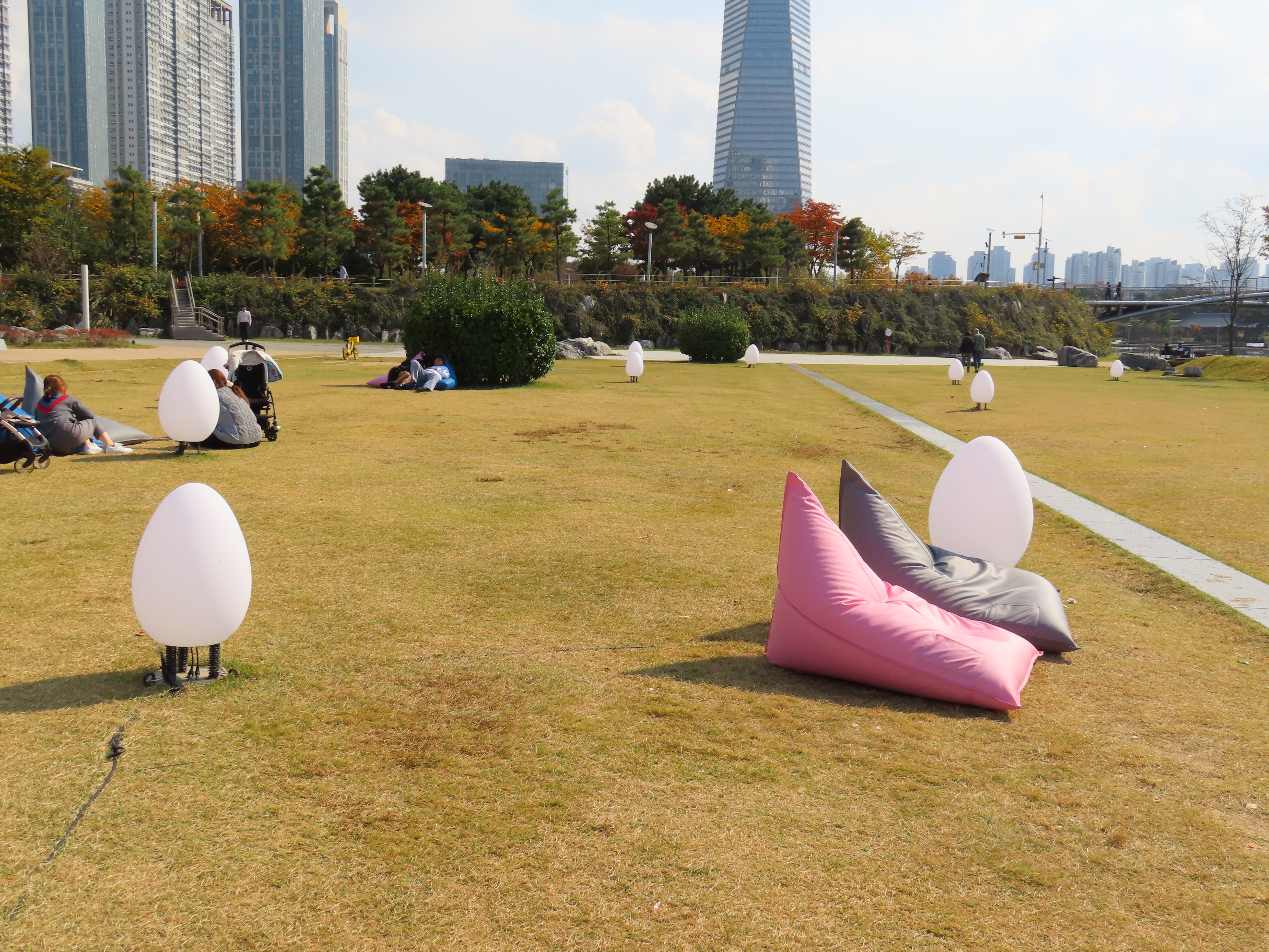 잔디밭에 방문객을 위해 만들어 놓은 공기를 넣은 의자들을 촬영하면서 ~~~